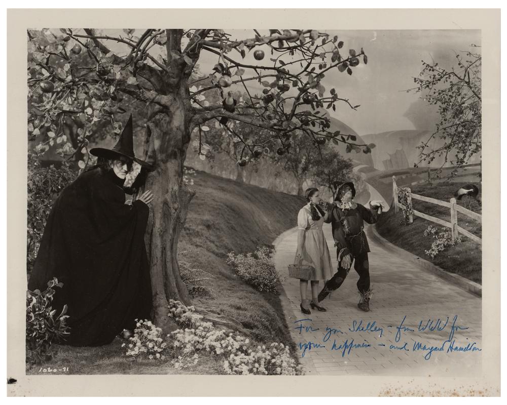 Glossy 10 x 8 photo of the Wicked Witch hiding behind a tree along the yellow brick road in a scene from The Wizard of Oz, signed and inscribed in fountain pen, "For you Shelley—from WWW for your happiness—and Margaret Hamilton.” In fine condition, with speckled staining to the bottom border.