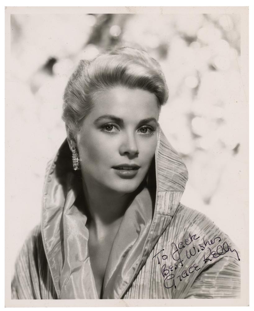 Vintage glossy 8 x 10 photo of Kelly wearing diamond earrings in a glamorous front-facing pose, signed and inscribed in fountain pen, "To Jack, Best wishes, Grace Kelly.” Affixed to a same-size mount and in very good to fine condition, with creasing to the sides and upper right corner, and scattered small surface blemishes.
