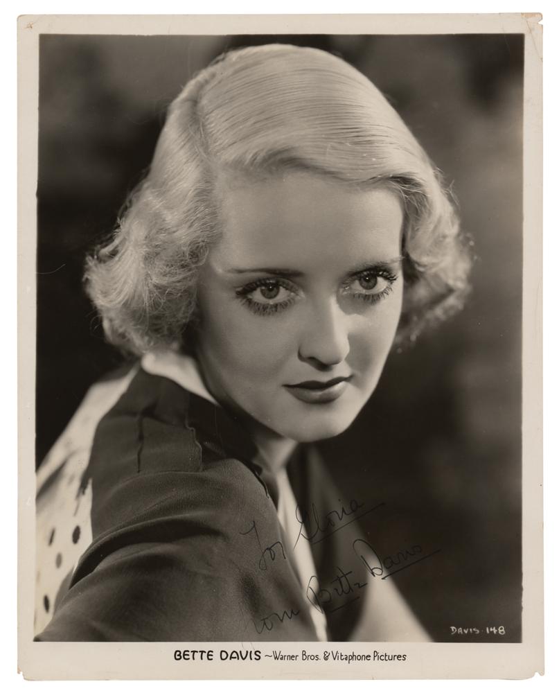Vintage glossy 8 x 10 Warner Bros. & Vitaphone Pictures publicity photo of Davis in a lovely early close-up pose, signed and inscribed in fountain pen, "For Gloria, from Bette Davis.” In very good to fine condition, with scattered creases, several of which touch her face.