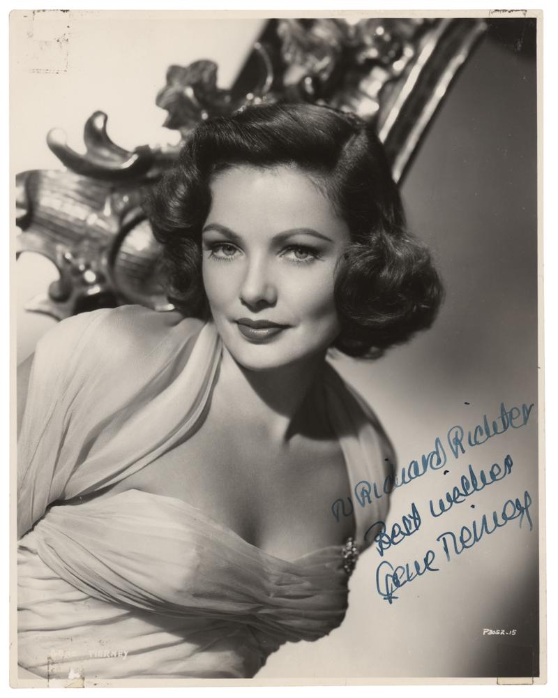 Vintage matte-finish 7.5 x 9.5 studio portrait of Tierney in an attractive bust-length pose, signed and inscribed in fountain pen, "To Richard Richter, Best wishes, Gene Tierney.” In very good to fine condition, with trimmed edges, old tape stains to the corners, and two small dents to the upper right background area.
