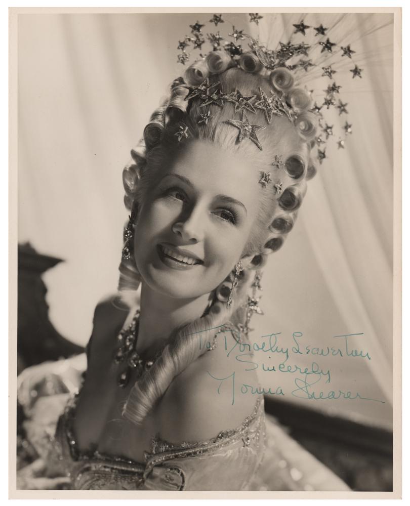 Vintage matte-finish 7.75 x 9.75 photo of Shearer as the title character in the 1938 film Marie Antoinette, signed and inscribed in fountain pen, "To Dorothy Leaverton, Sincerely, Norma Shearer.” In very fine condition, with neatly trimmed edges.