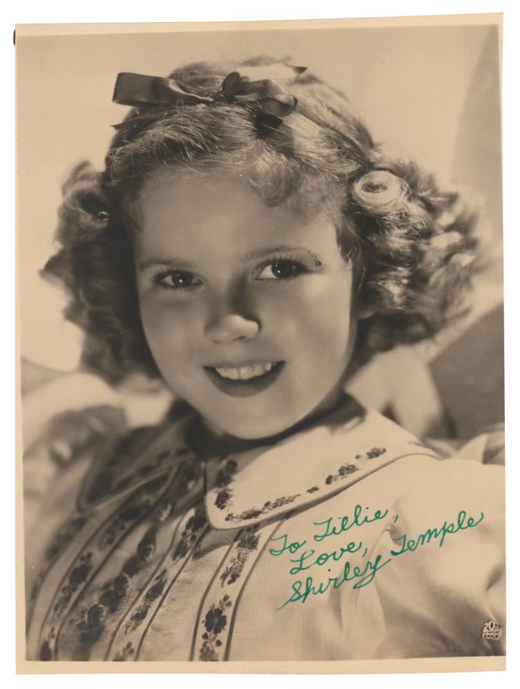 Vintage matte-finish 5 x 6.75 photo of the adorable box-office sensation, signed and inscribed in green fountain pen, "To Lillie, Love, Shirley Temple.” In fine condition, with trimmed edges.