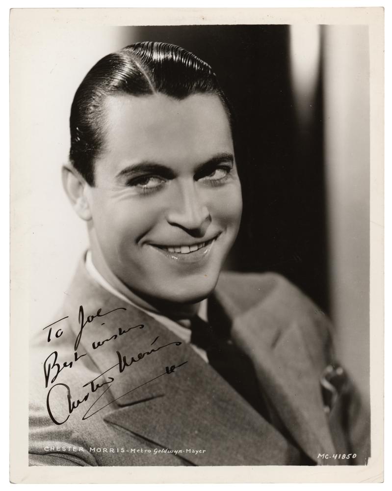 Vintage glossy 8 x 10 MGM studio portrait, signed and inscribed in fountain pen, "To Joe, Best wishes, Chester Morris.” In fine condition, with some light creasing to the right edge.