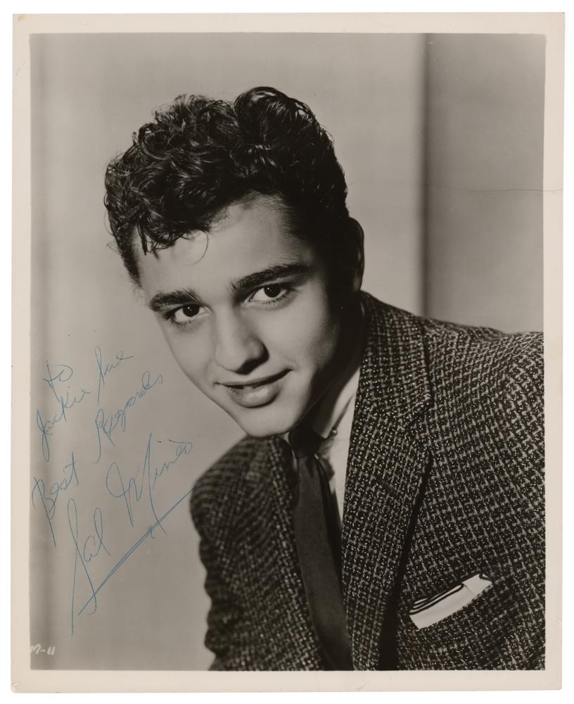 Glossy 8 x 10 publicity photo of a young Mineo, signed and inscribed in blue ballpoint, "To Jackie Sue, Best regards, Sal Mineo.” In fine condition.
