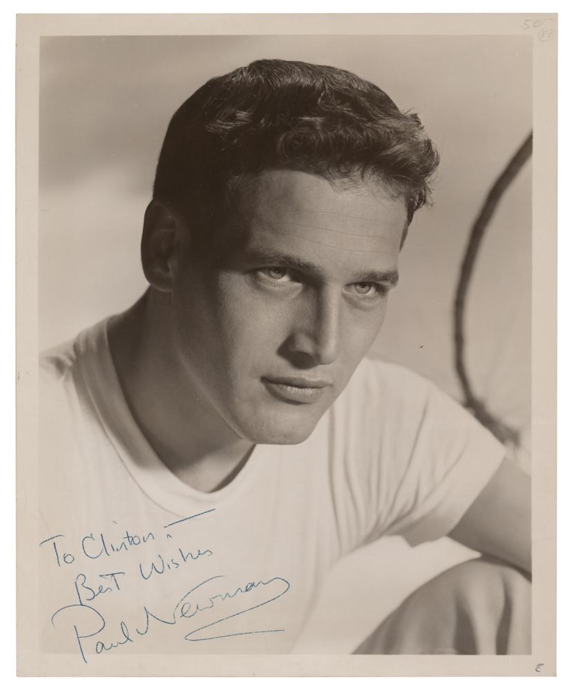Glossy 8.25 x 10 double-weight photo of a young Paul Newman wearing a plain white t-shirt, signed and inscribed in black ballpoint, "To Clinton—Best wishes, Paul Newman.” In fine condition, with two small creases barely touching Newman's face.