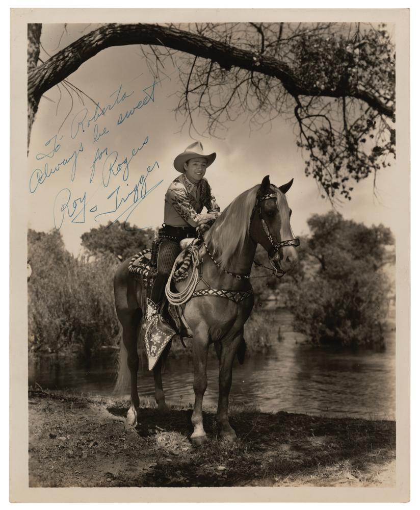 Excellent vintage glossy 8 x 10 full-length photo of Roy Rogers and his favorite horse posing next to a river bank, signed and inscribed in fountain pen, "To Roberta, Always be sweet for Roy Rogers & Trigger.” Reverse bears a Republic Pictures Star stamp and a Republic Studios Photograph stamp for Mickey Marigold. In fine condition.