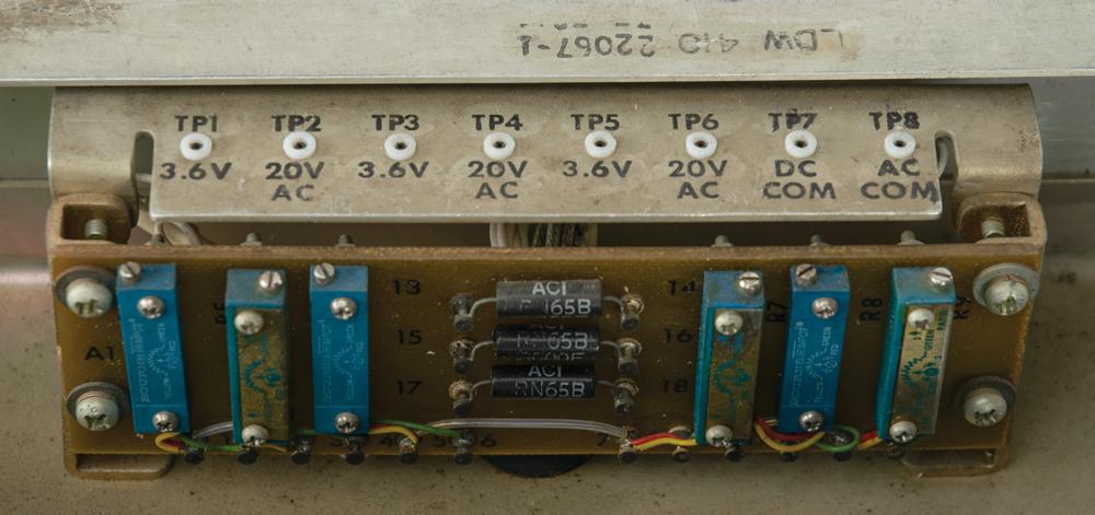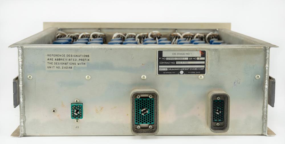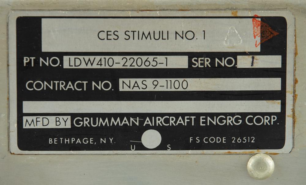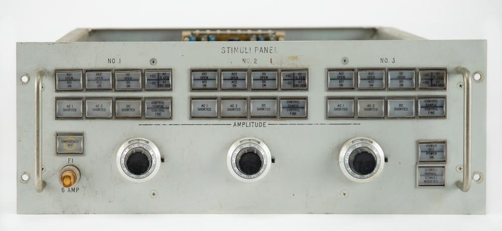 NASA/Apollo Lunar Module CES Stimuli #1 Control Panel, measuring approximately 19″ x 7″ x 20″, with its Grumman identification plate on the reverse: "CES Stimuli No. 1, Pt. No. LDW410-22065-1, Ser. No. 1, Contract No. NAS9-1100." The panel's face has three banks of identical buttons, marked "No. 1," "No. 2," and "No. 3," and three adjustment knobs for "Amplitude." In very good to fine condition, with most buttons sticky.