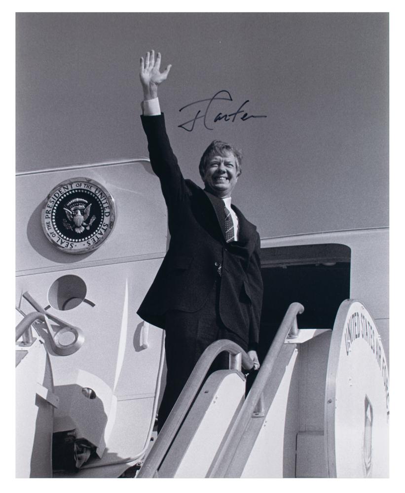 Satin-finish 16 x 20 photo of President Carter waving from the steps of Air Force One, signed in black felt tip, "J. Carter." In fine condition.
