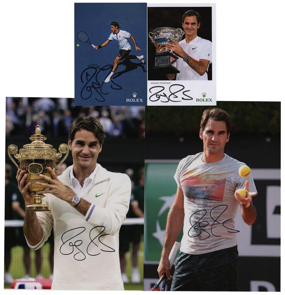Four items signed in black felt tip by Roger Federer, including two different color 4 x 6 Rolex promo cards and two color glossy 8 x 11 photos. In overall fine condition, with a couple of surface scratches touching Federer's face in the larger trophy photo.