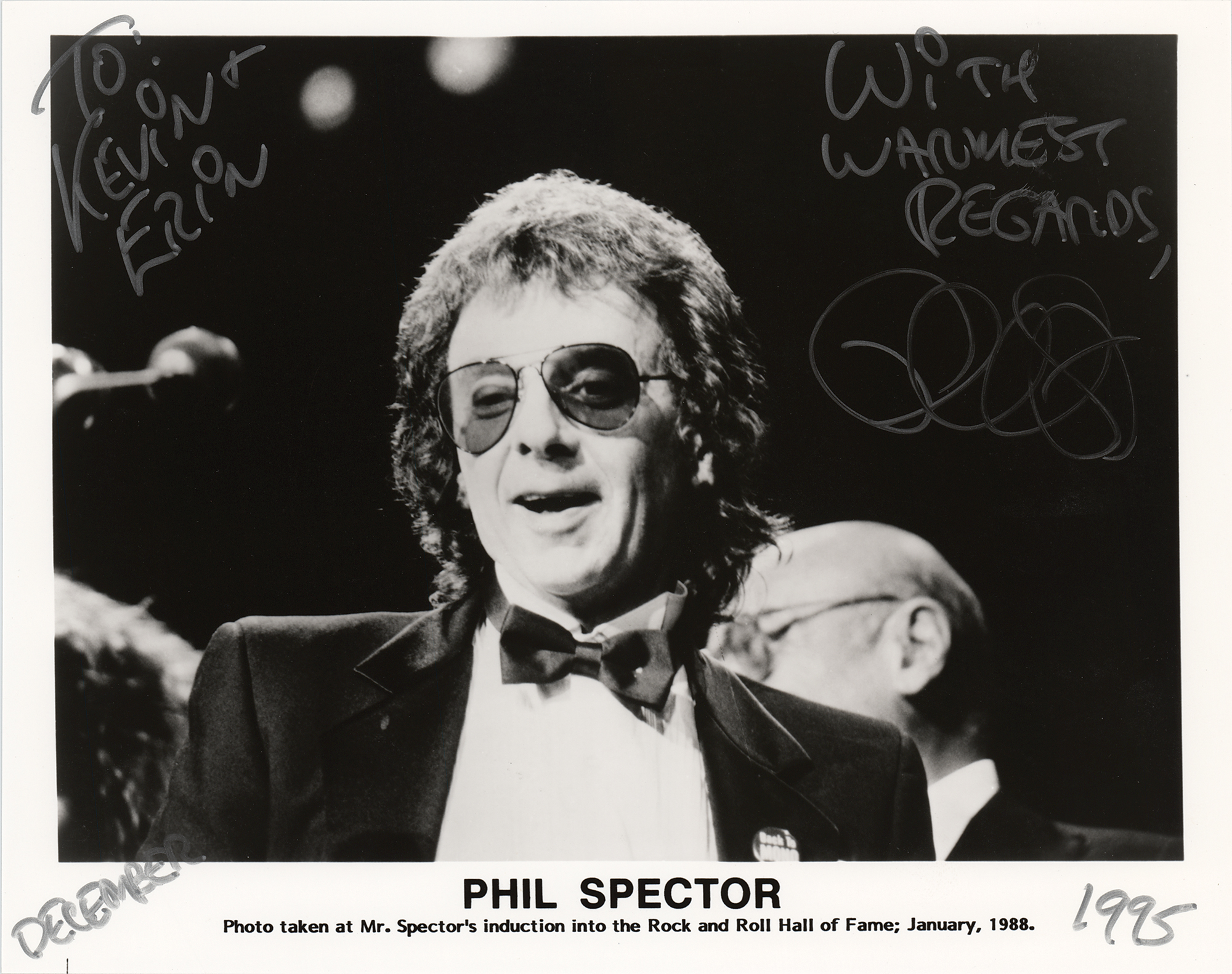 Satin-finish 10 x 8 photo of Spector during his 1988 induction into the Rock and Roll Hall of Fame, signed and inscribed in silver ink, "To Kevin & Erin, with warmest regards, Phil Spector, December, 1995.” In fine condition.