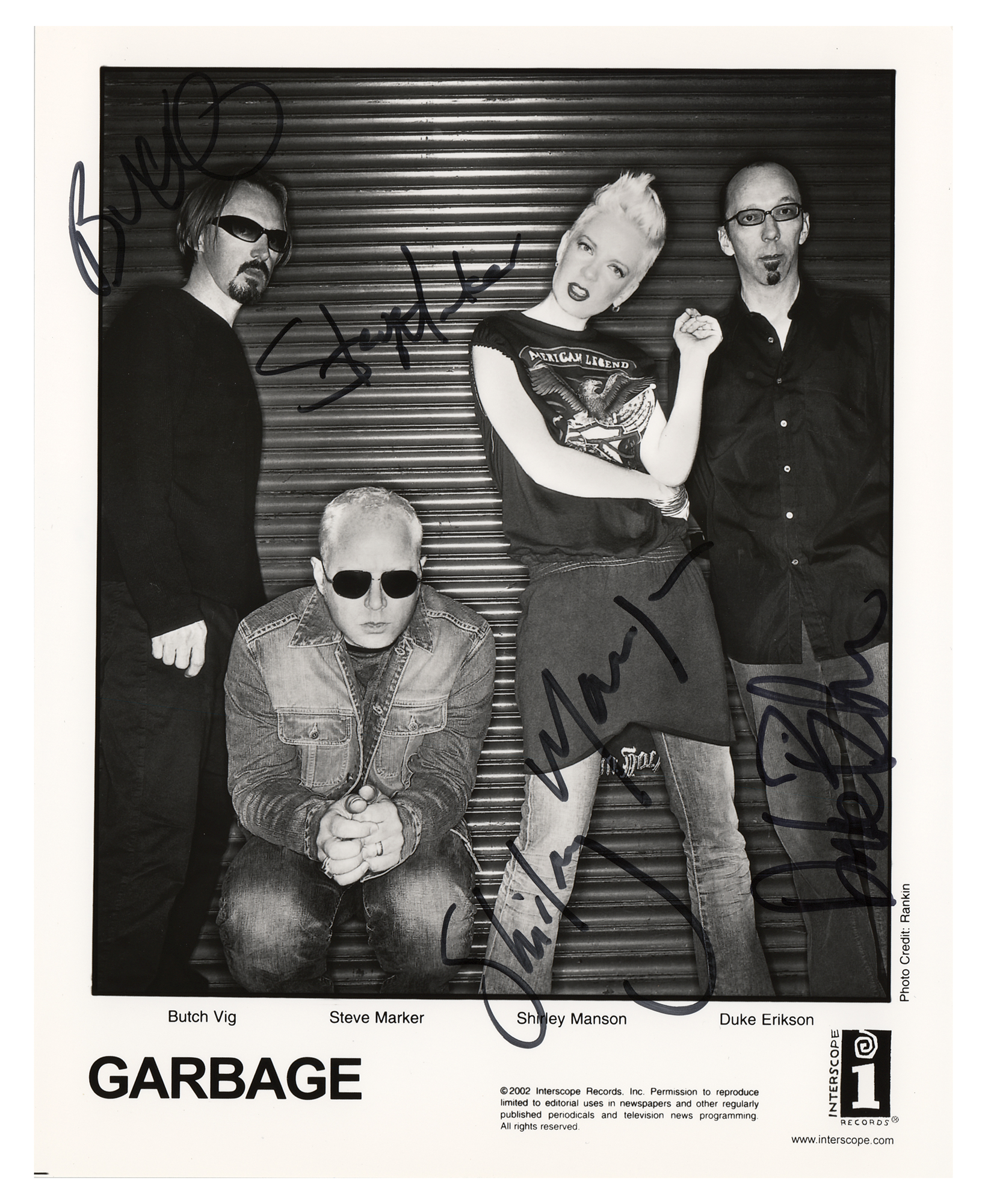 Satin-finish 8 x 10 Interscope Records publicity photo of Garbage that dates to their Beautiful Garbage album, signed in black felt tip by Duke Erikson, Shirley Manson, Steve Marker, and Butch Vig. In fine condition.