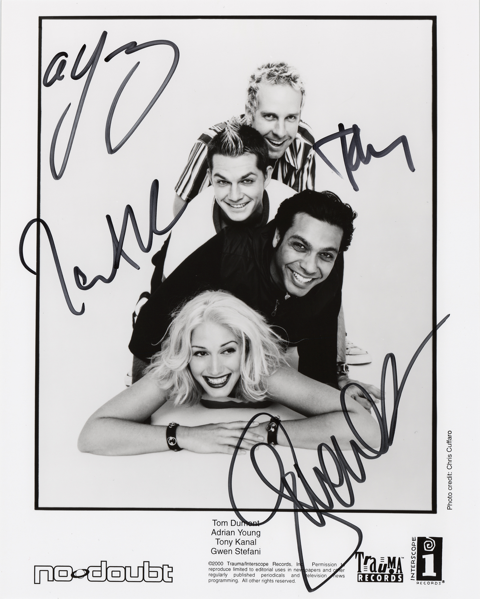 Satin-finish 8 x 10 Interscope / Trauma Records publicity photo of No Doubt that dates to their Return of Saturn album, signed in black felt tip by Gwen Stefani, Tony Kanal, Adrian Young, and Tom Dumont. In very fine condition.