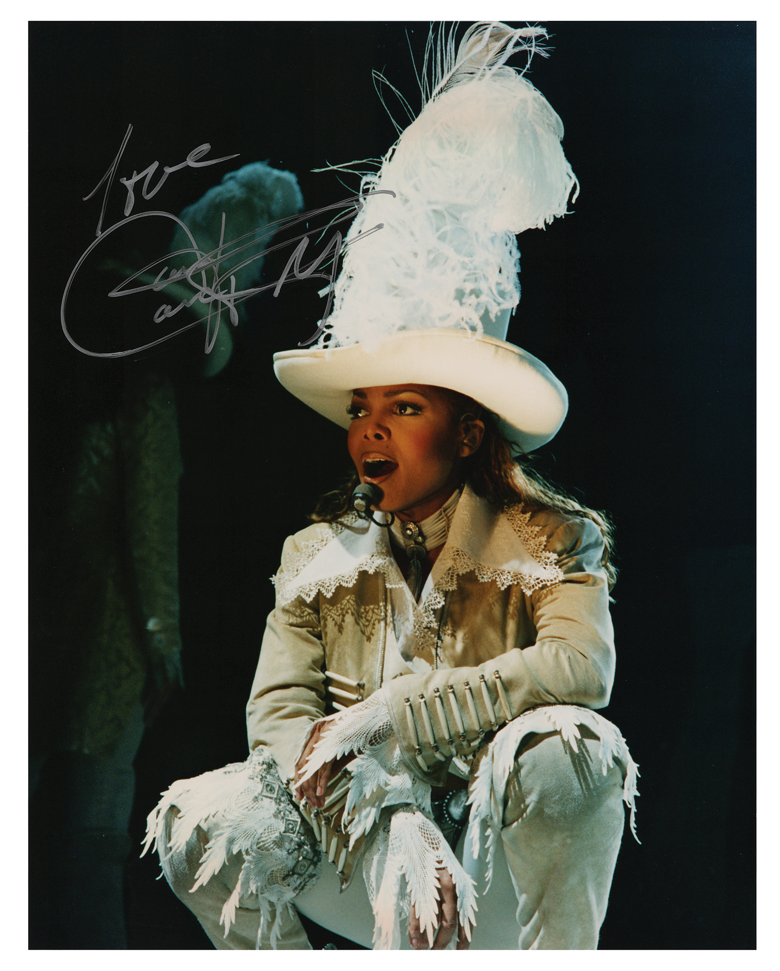 Color glossy 11 x 14 photo of Janet Jackson wearing a Western-style outfit during a live performance, signed in silver ink. In fine condition. Accompanied by an unused backstage 'working' pass for a Janet Jackson concert at the Hartford Civic Center in Hartford, Connecticut, on August 11, 2001.