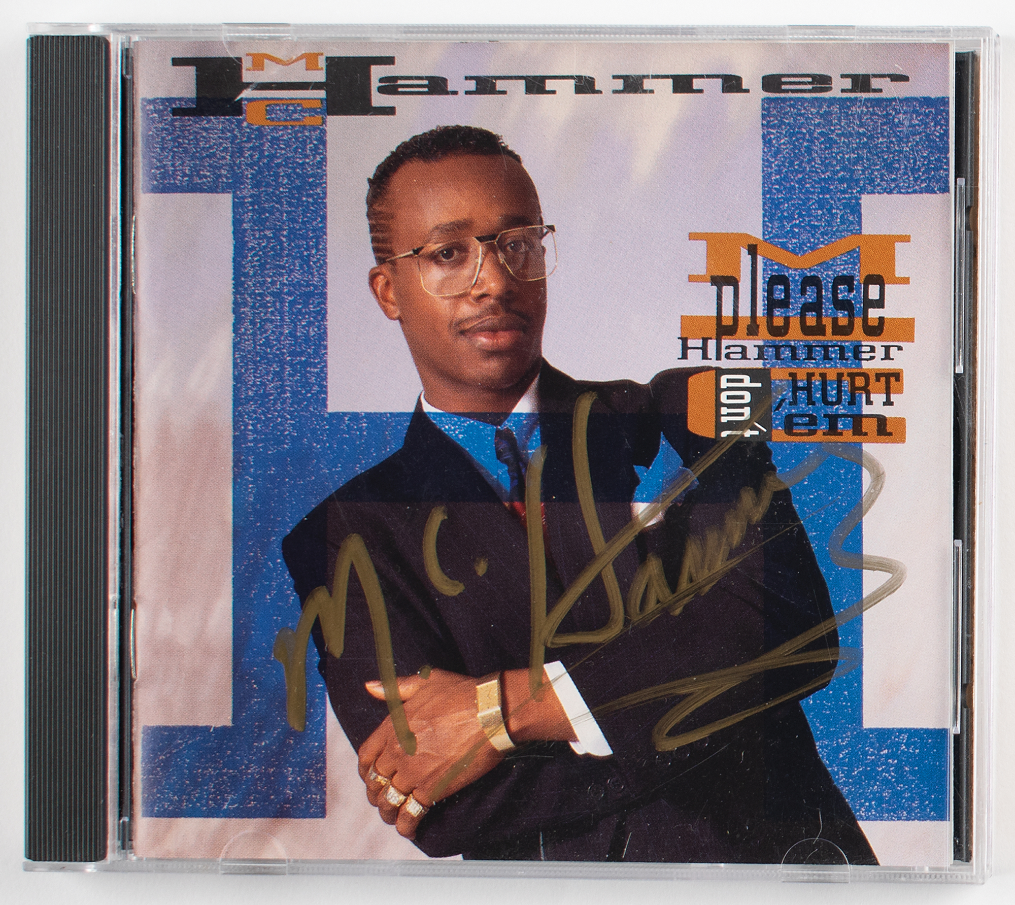 Please Hammer Don't Hurt 'Em CD by MC Hammer, who has signed the front cover in gold ink. In fine condition. The CD is included. Accompanied by an unused backstage 'local crew' pass for MC Hammer's 1992 Too Legit Tour.