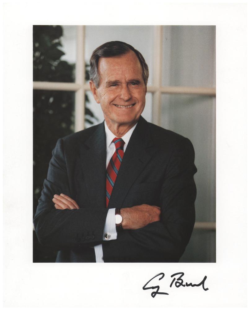Color 8 x 10 cardstock photo of Bush in a suit and tie, signed in the lower border in black felt tip. In very fine condition.