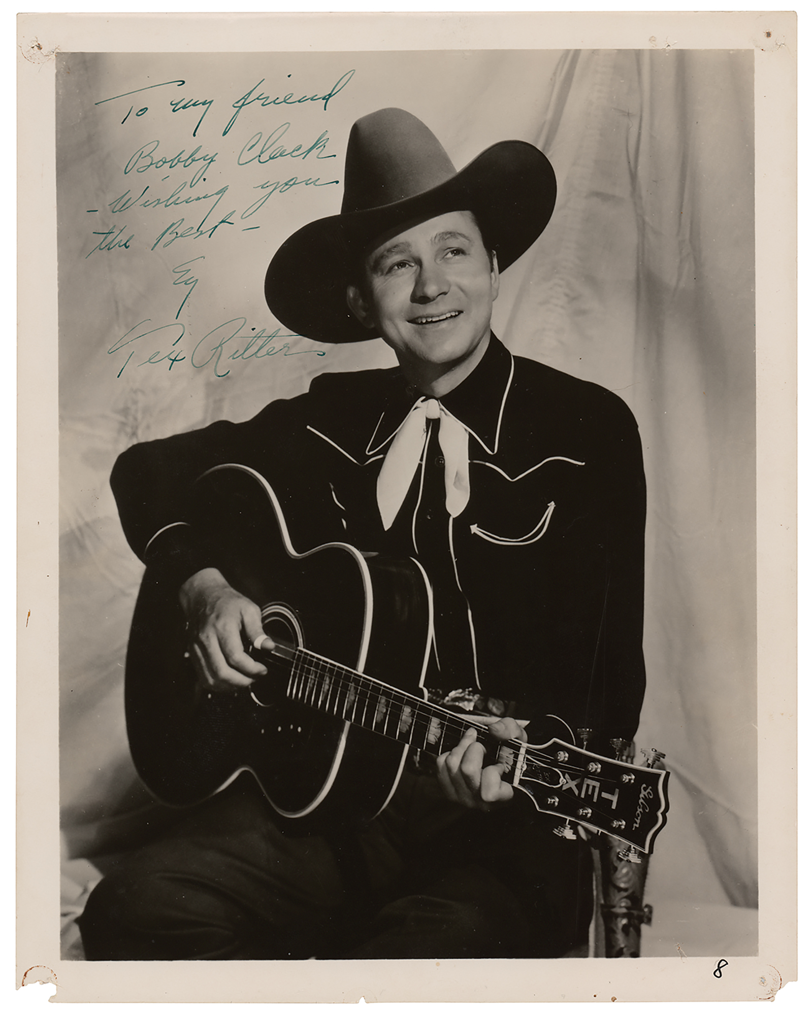 Vintage glossy 8 x 10 photo of Ritter in cowboy garb, posing with his custom Gibson acoustic guitar, signed and inscribed in fountain pen, "To my friend Bobby Clark?Wishing you the Best?Tex Ritter.? In very good to fine condition, with tack holes and minor loss to the corners.