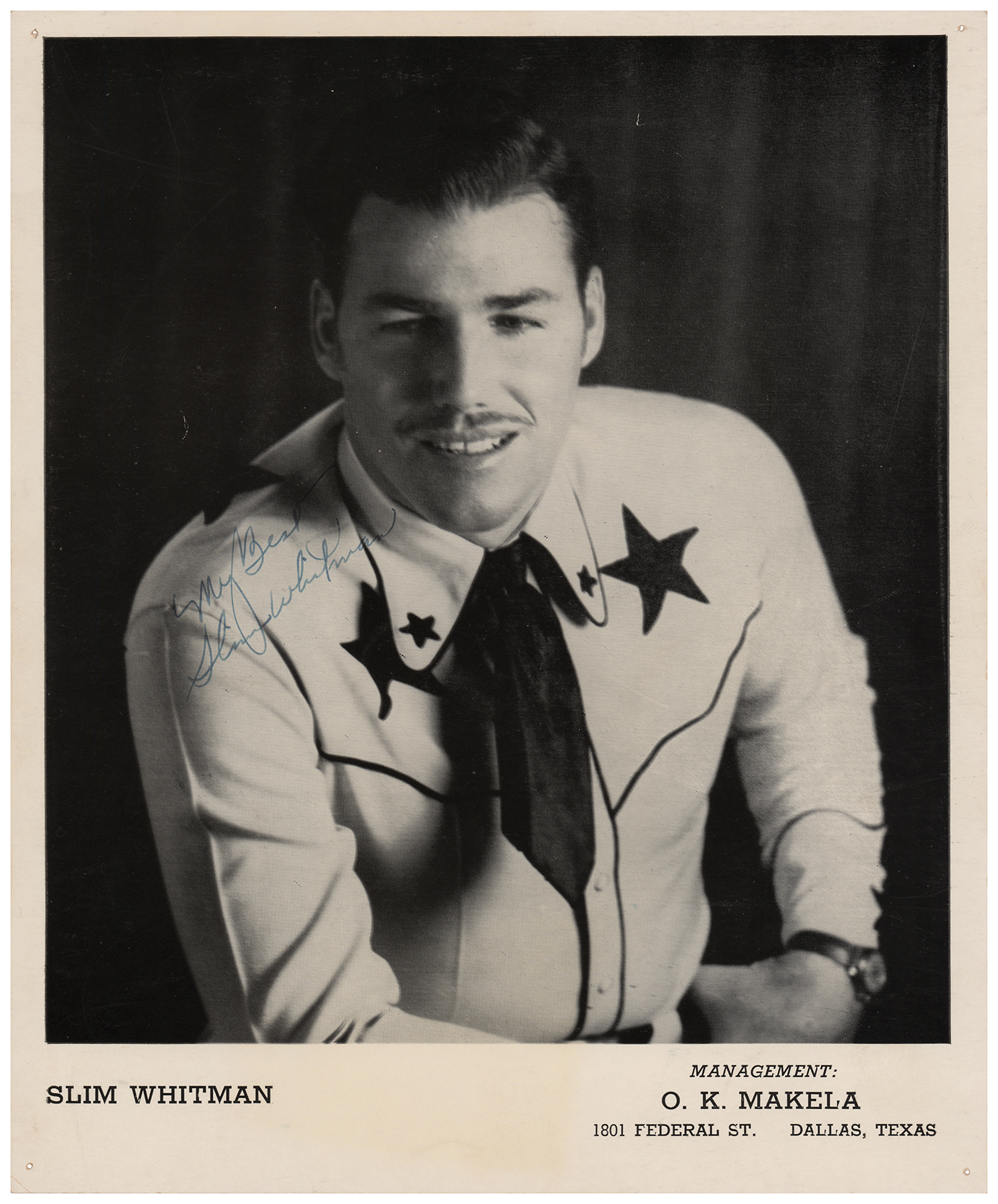 Vintage 8 x 10 cardstock photo of Whitman in his Western garb, signed in fountain pen, "My best, Slim Whitman." In fine condition, with tack holes to the corners.