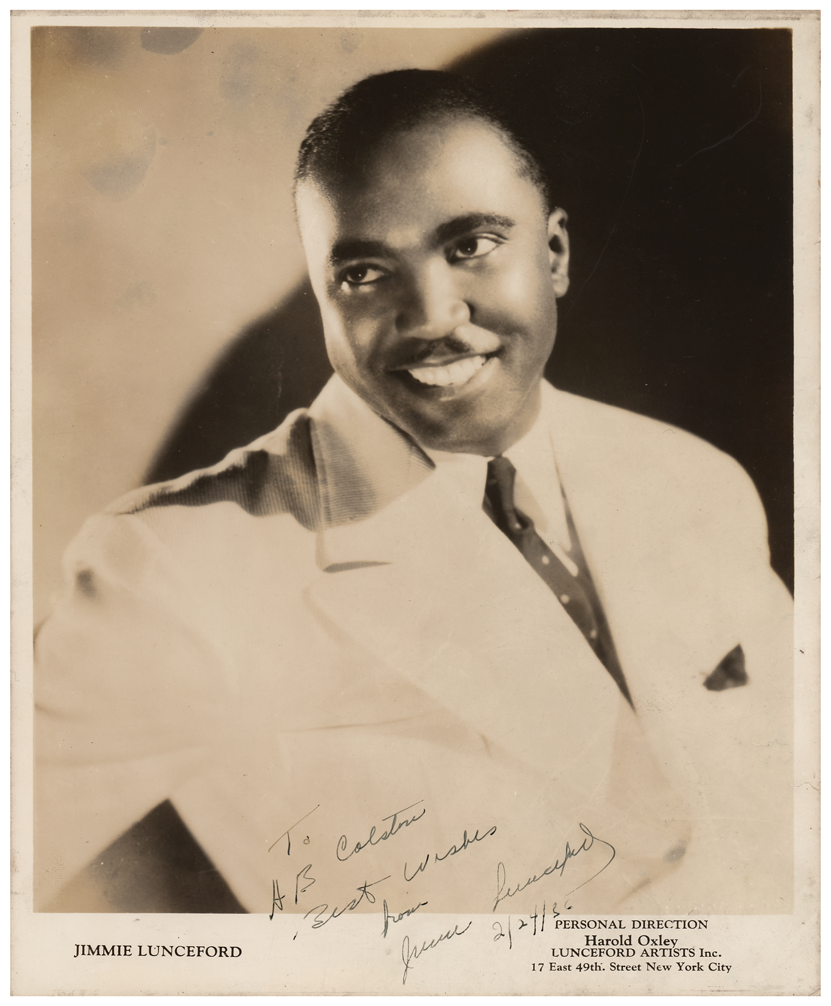 Vintage glossy 8 x 10 agency photo of the swing bandleader in a suit and tie, signed and inscribed in fountain pen, "To A. B. Colston, Best wishes from Jimmie Lunceford, 2/24/36." In fine condition, with a short tear to the right border.