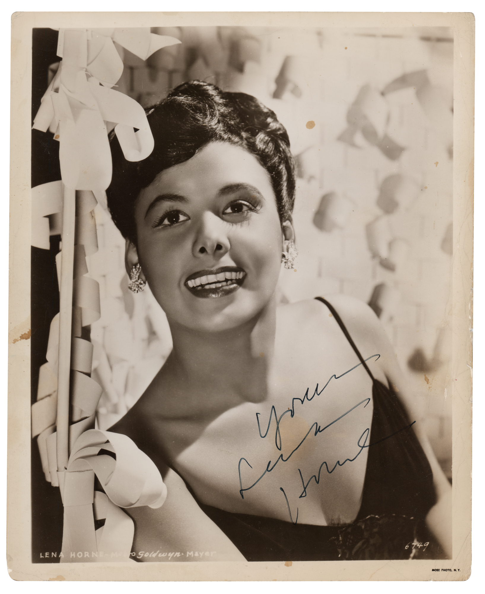 Glossy 8 x 10 MGM photo of the popular singer-actress, signed in black felt tip, "Yours, Lena Horne." In very good condition, with overall creasing and scattered stains.