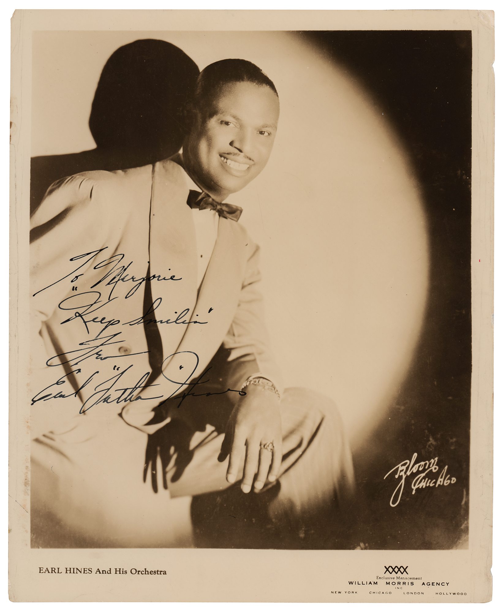 Vintage glossy 8 x 10 William Morris Agency photo of Hines in a spotlight, signed and inscribed in fountain pen, "To Marjorie, Keep Smilin', From Earl 'Fatha' Hines.” In very good to fine condition, with scattered light creasing, heavier in the side borders.