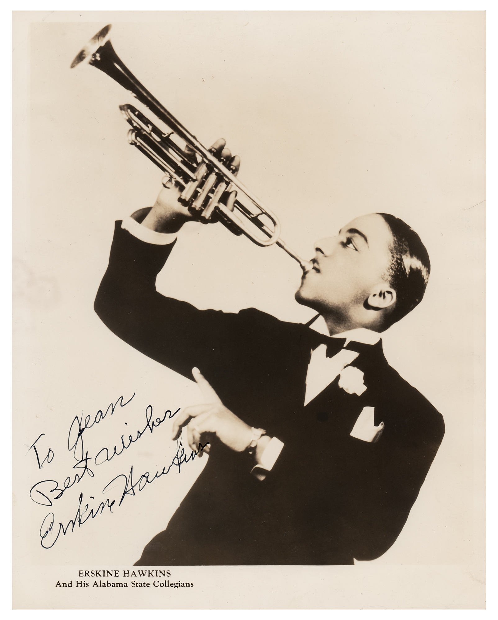 Vintage glossy 8 x 10 publicity photo of Hawkins with his trumpet, signed and inscribed in fountain pen, "To Jean, Best Wishes, Erskine Hawkins.” In fine condition, with light edge rippling. A nice pose of the great trumpeter and big band leader.