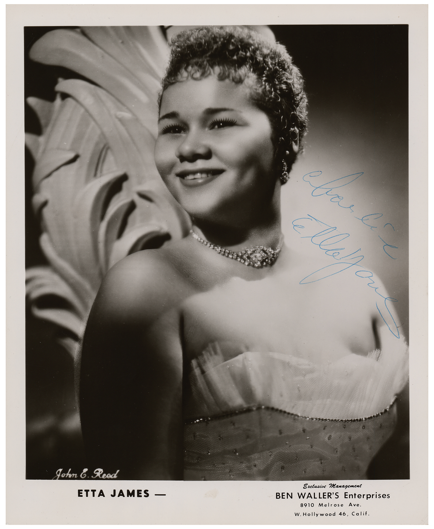 Vintage glossy 8 x 10 agency photo of James in a strapless dress, signed and inscribed in blue ballpoint, "Charlie, Etta James.” In fine condition, with light surface impressions to the upper right corner from a notation on the back.