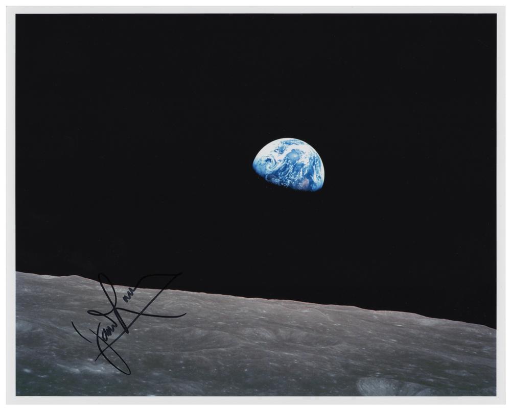 Iconic color satin-finish 10 x 8 photo of the Apollo 8 'Earthrise,' signed in black felt tip by CMP James Lovell. In very fine condition.