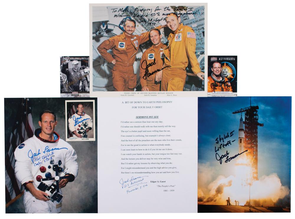 Seven items signed in felt tip by Jack Lousma, including: three trading cards, three 8 x 10 photos (one inscribed), and a souvenir typescript of Edgar Guest's poem 'Sermons We See.' In overall fine condition.