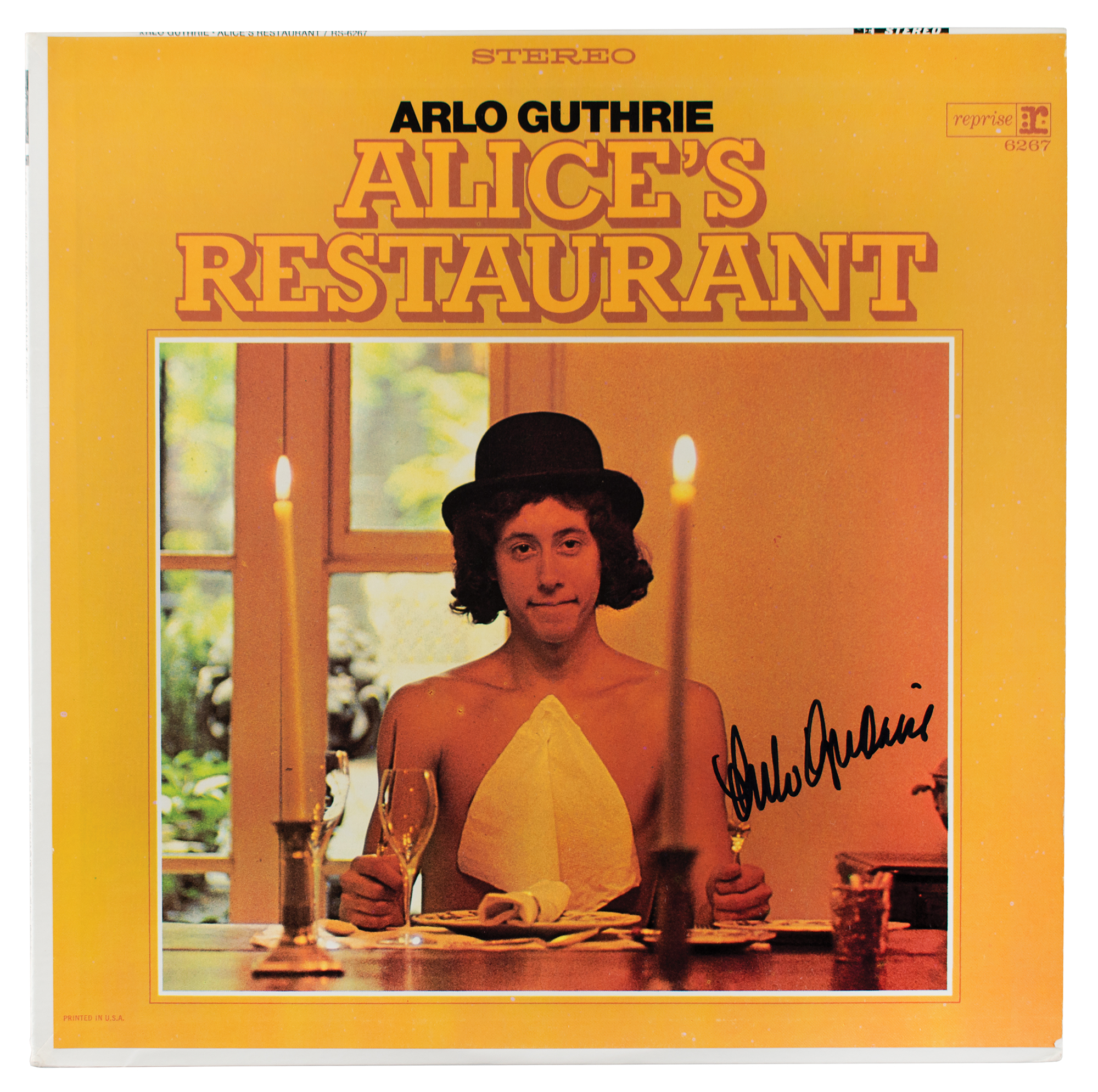 Alice's Restaurant album signed on the front cover in black felt tip, "Arlo Guthrie." In fine condition. The record is included.