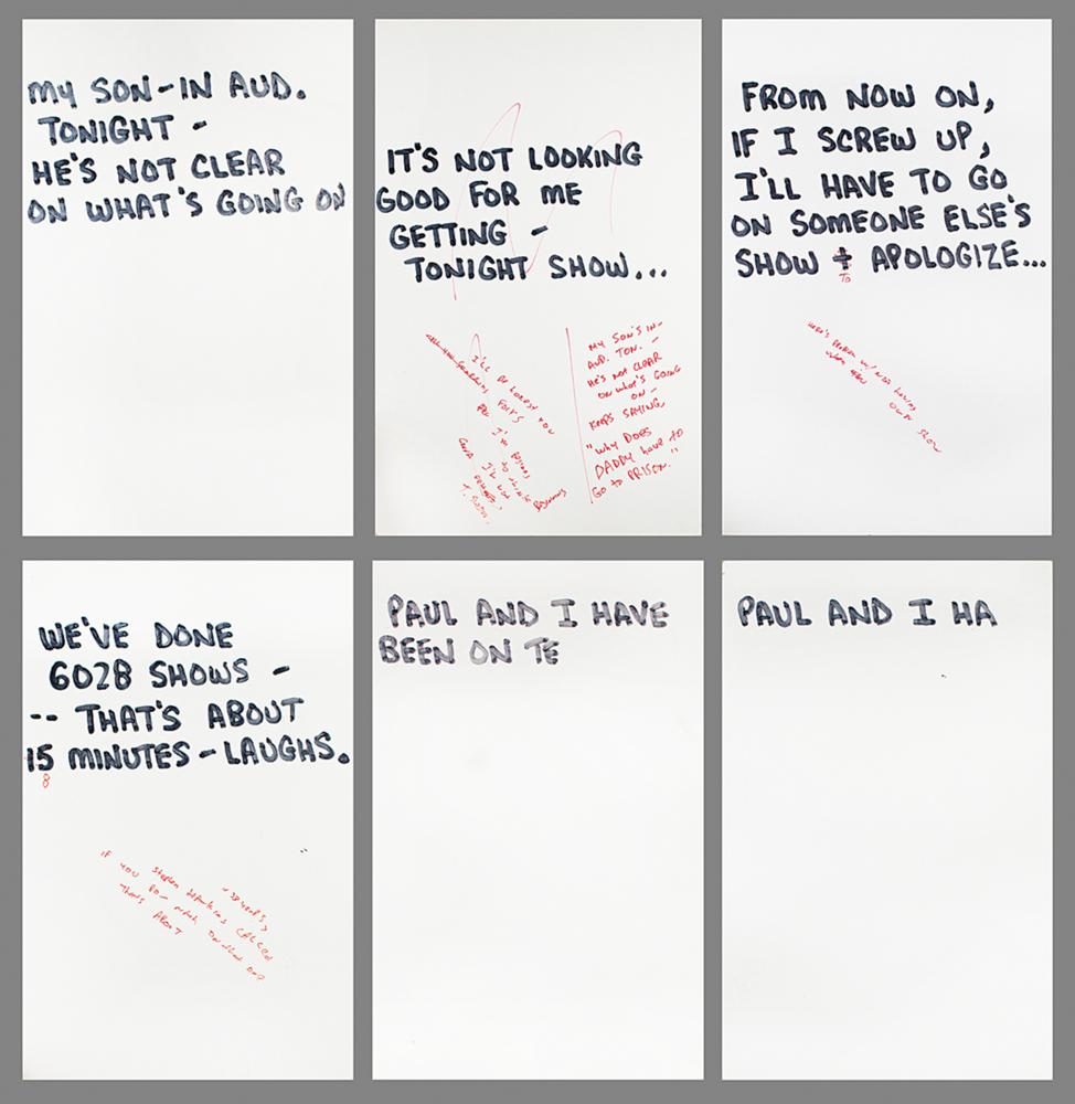 Collection of six 14 x 22 cue cards from the historic final show of the Late Show with David Letterman on CBS on May 20, 2015, representing jokes from Letterman's last monologue as one of America's beloved late-night hosts. The cue cards offer some comedic observations on his show and a few incomplete thoughts referencing his longtime bandleader sidekick Paul Shaffer. The cards read: "It's not looking good for me getting—Tonight Show?" (with writer's notes joking about his son: "Keeps saying, 'Why does Daddy have to go to prison"); "From now on, if I screw up, I'll have to go on someone else's show to apologize"; "My son—in aud. tonight—he's not clear on what's going on"; "Paul and I have been on te"; and "Paul and I ha." In overall fine condition. Consignor notes that these originate from the estate of Kenny Sheehan, a longtime Letterman showhand remembered for cameo appearances in which he read out-of-context Oprah interview transcripts. A great collection representing the end of an era, highlighted by the cue card representing Letterman's opening joke: 'I want to tell you one thing, I'll be honest with you, it's beginning to look like I'm not going to get 'The Tonight Show.''