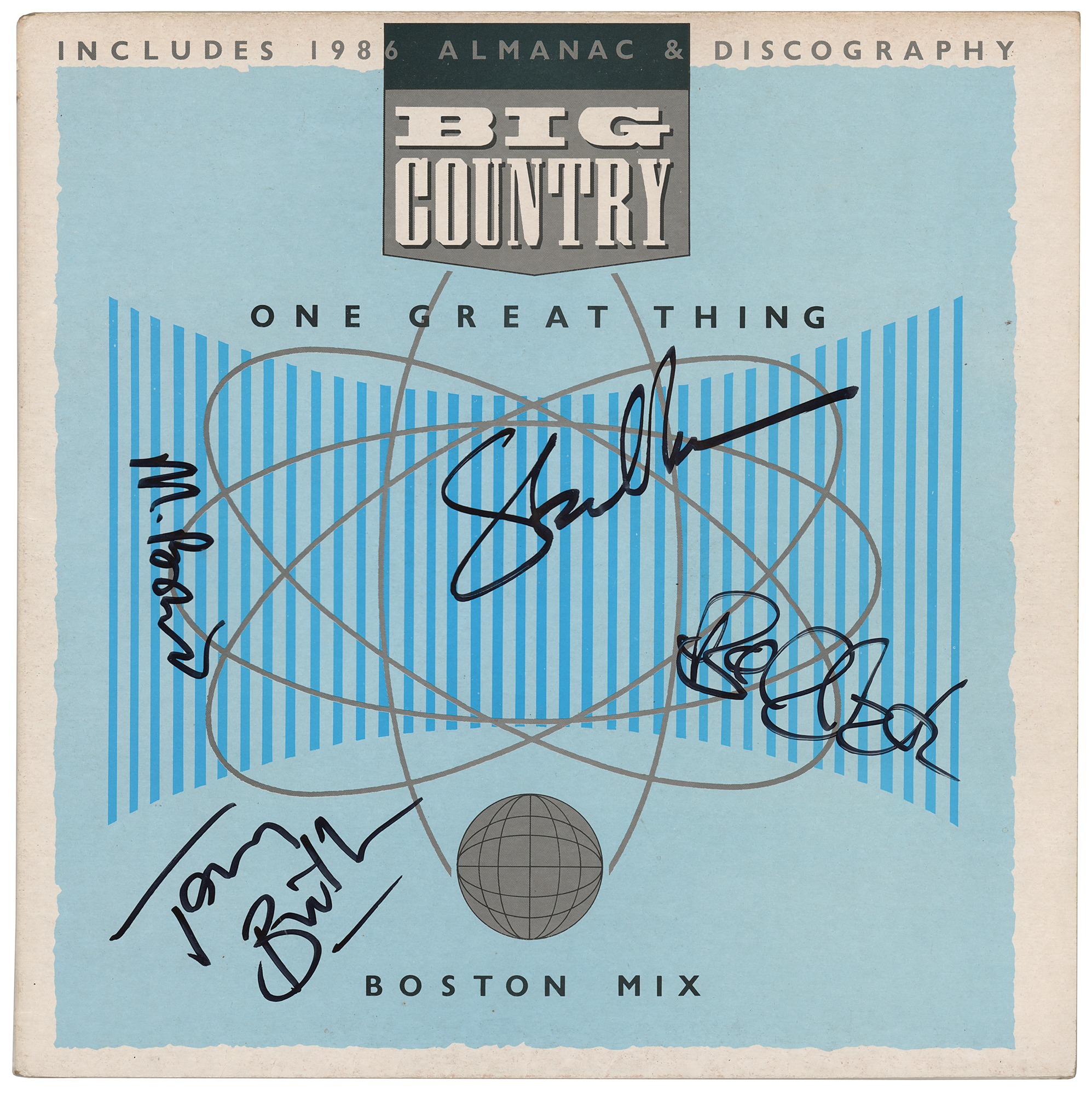 Big Country single album for 'One Great Thing (Boston Mix) / Song of the South,' signed on the front cover in black felt tip by Stuart Adamson, Mark Brzezicki, Bruce Watson, and Tony Butler. In fine condition. The record is not included. Accompanied by a full letter of authenticity from JSA.
