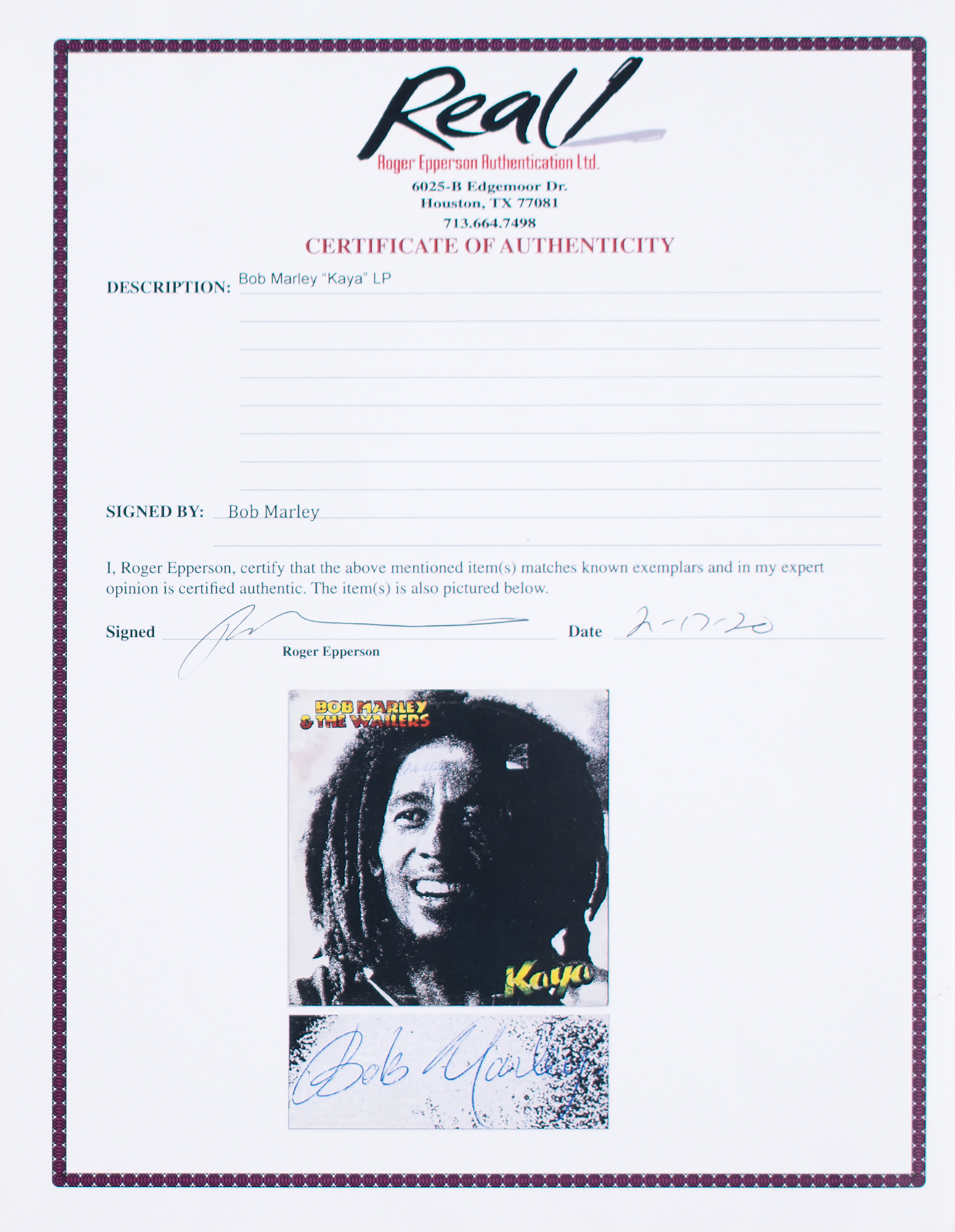 Kaya album by Bob Marley & the Wailers, signed nicely on the front cover in blue ballpoint by Marley. In very good to fine condition, with an area of surface scuffing to the upper left background, and some old sticker residue to Marley's hair. The record is included. Accompanied by a full letter of authenticity from REAL.