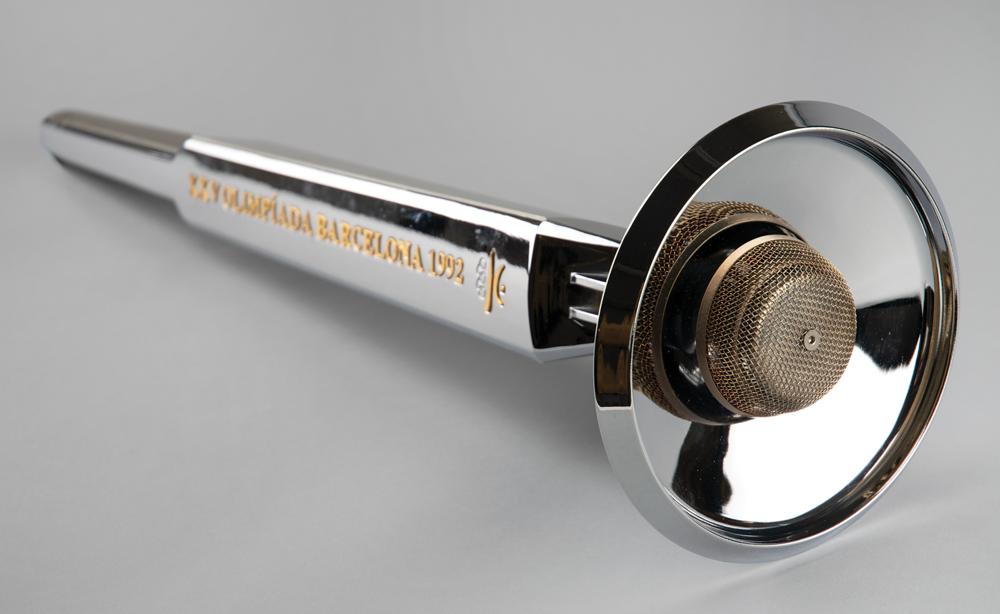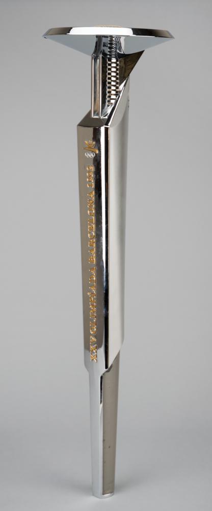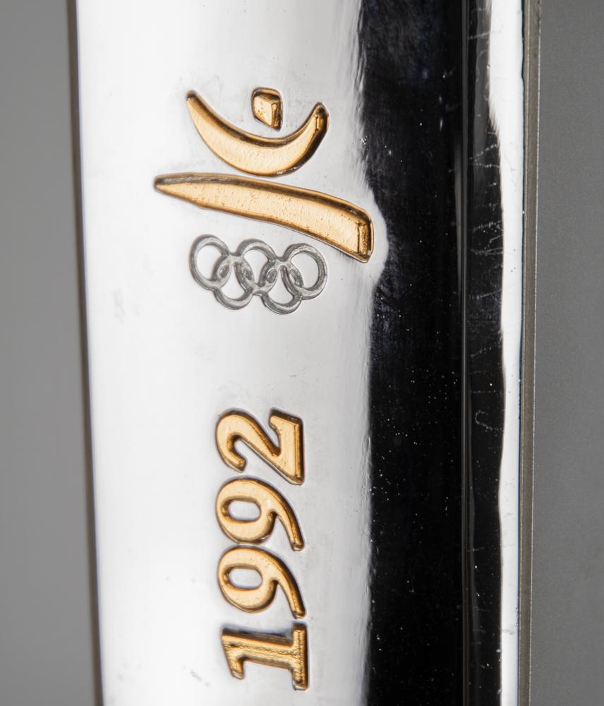 Official 1992 Barcelona Olympics torch, comprised of aluminum and plastic, measuring 26″ in length and 7″ at its widest point, designed by Andre Ricard. The metal body is inscribed in gold text, “XXV Olimpiada Barcelona 1992,” and bears the emblem of the Games. The sliding red switch to reverse is engraved "000070." Exhibits some minor scuffs to the rubberized handle. The massive fifty-day relay included nearly 9,500 torchbearers who carried the Olympic flame by foot and bicycle for a total of 5,940 km throughout Spain. The lighting of the cauldron at the opening ceremonies was especially memorable, as Paralympic archer Antonio Rebollo ignited the cauldron by shooting an arrow lit from the Olympic flame. An impressive torch with a decidedly modern design.
