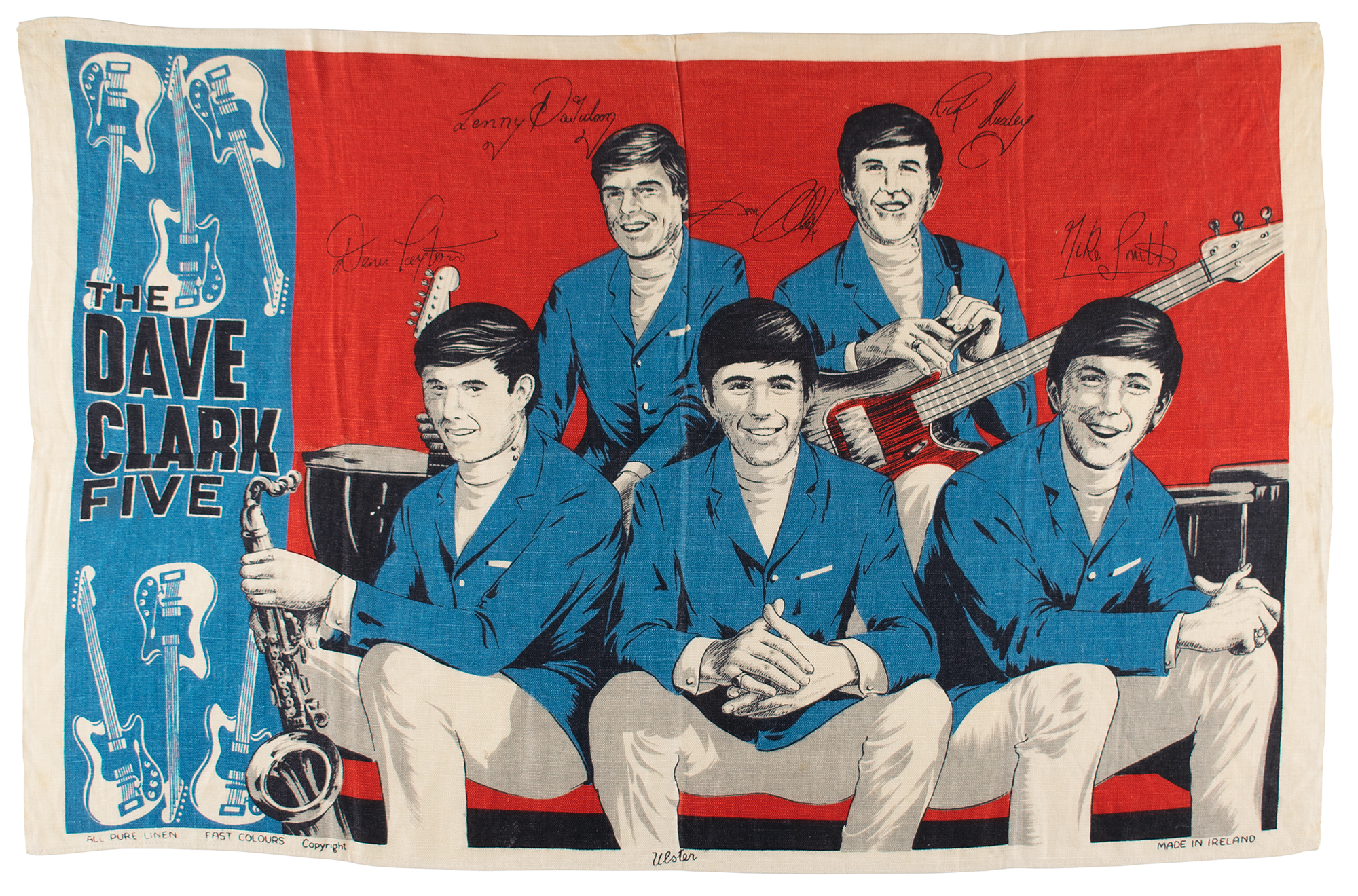 Appealing, colorful original vintage circa 1960s Ulster linen Dave Clark Five tea towel, 31 x 20, featuring an image of the band with their facsimile signatures. Printed along the bottom: "All Pure Linen, Fast Colours, Copyright, Ulster, Made in Ireland." In fine condition, with minor discoloration and staining. Accompanied by a certificate of authenticity from Tracks.