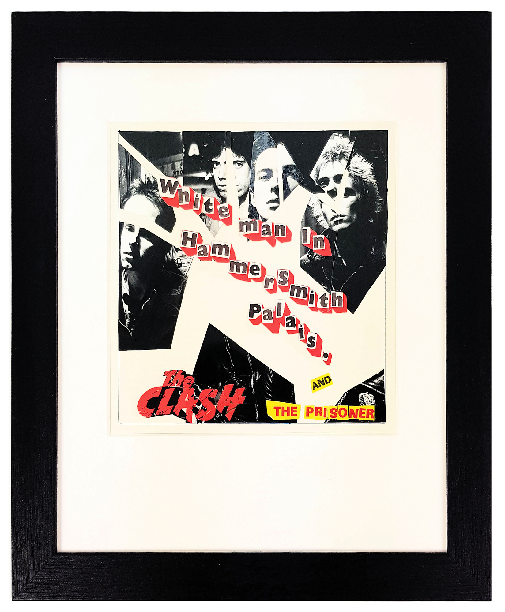 Unique original handmade collage concept artwork designed by Paul Simonon and Joe Strummer as a potential sleeve for The Clash's 1978 single by ‘(White Man) In Hammersmith Palais.’ Accomplished in mixed media on 7.75 x 7.75 sheet, the artwork consists of a cut-up glossy photograph of the group with the song title across the middle in a 3D effect and the band name at the bottom. Handsomely matted and framed to an overall size of 12.75 x 14.5. In fine condition. Accompanied by a copy of an email from artist Caroline Coon, in full: "If I remember correctly, the original collage artwork for the 'White Man in Hammersmith Palais' single was designed and made by Paul Simonon with Joe Strummer and brought to me for discussion in by Ladbroke Grove studio." Also includes a certificate of authenticity from Tracks, stating that the artwork comes from the collection of artist Caroline Coon. An English artist, journalist, and political activist involved in the London punk scene in the 1970s, Coon created artwork for groups including The Clash (whom she briefly managed) and The Police.