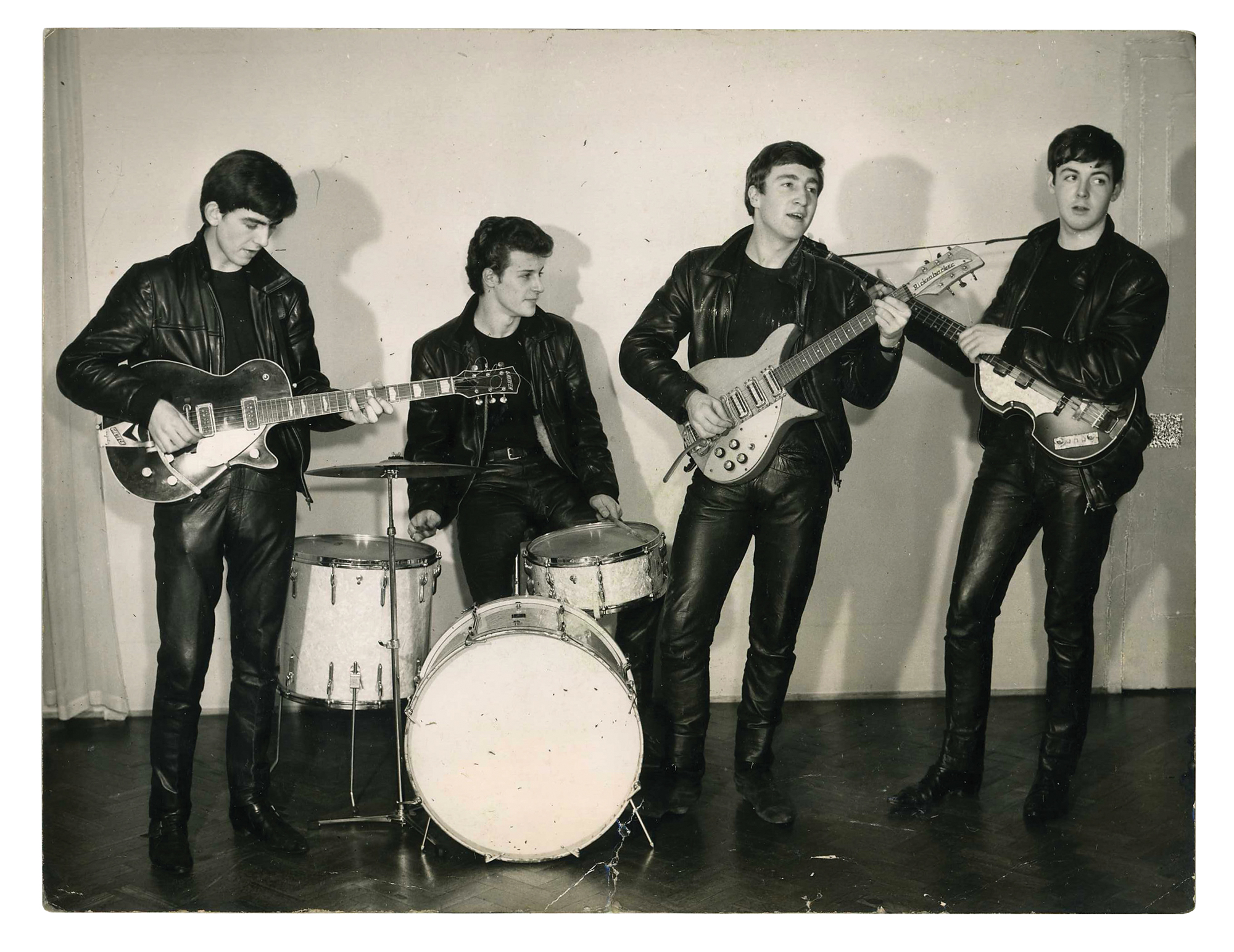 Exceptionally rare vintage semi-glossy 8.5 x 6.5 silver gelatin photo of the Beatles that was taken in the photography studio of Albert Marrion in Wallasey, Merseyside, on December 17, 1961. This was the group’s first ever professional photo shoot and it was paid for by Brian Epstein. It depicts John Lennon, George Harrison, Paul McCartney, and Pete Best dressed in leather and posing with their instruments. The photograph was developed in Marrion’s studio and was obtained by a former employee. In very good to fine condition, with light scuffing, creasing and a tear to the bottom edge.