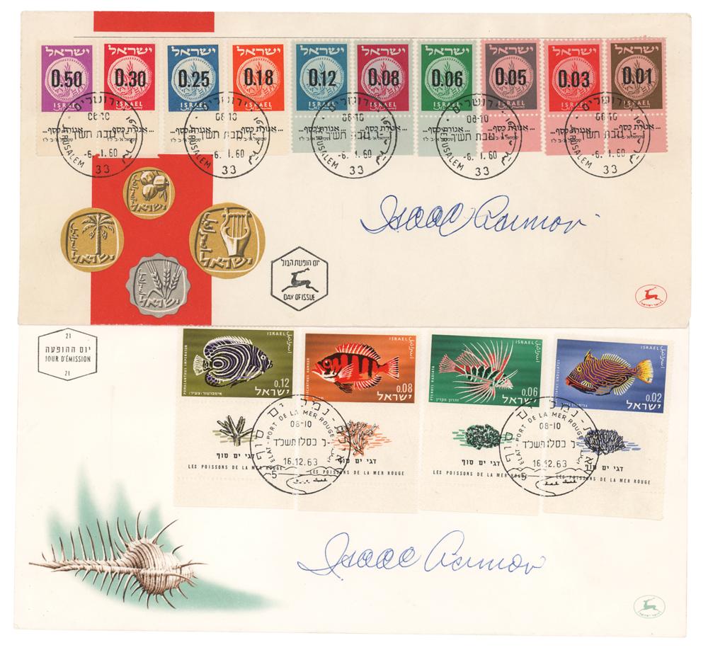 Desirable pairing of two Israeli FDCs, each signed in blue ballpoint by Isaac Asimov. In overall fine condition.