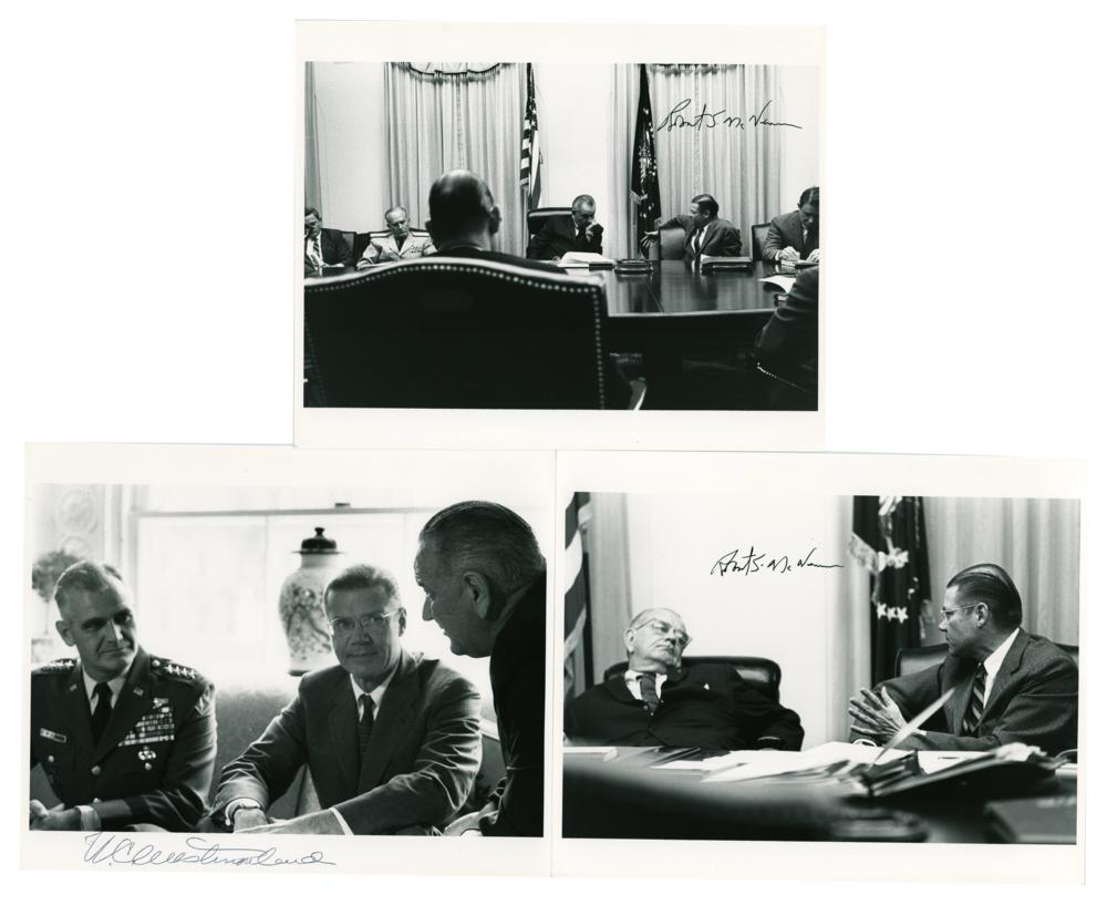 Three glossy 10 x 8 photos of meetings with President Lyndon B. Johnson, with two signed in black felt tip by Robert S. McNamara and one signed in black ballpoint by William C. Westmoreland. In overall fine condition.