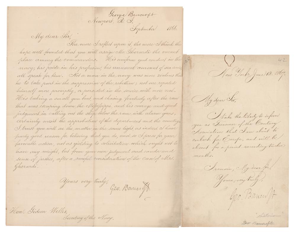 American historian, Secretary of the Navy, and diplomat (1813-1871) who established the United States Naval Academy at Annapolis. LS signed “Geo. Bancroft,” one page, 8 x 10, September 1866. Letter to Secretary of the Navy Gideon Welles, in part: "The more I reflect on it, the more I think the hope well founded that you will assign Mr. Gherardi the vacant place among the commanders. His uniform good conduct in the navy, his pride in his profession, his unusual amount of sea service, all speak for him. Not a man in the navy was more zealous than he to take part in the suppression of the rebellion; not one reported himself more promptly, or persisted in the service with more zeal. His taking a small gun boar, and chasing fearlessly after the ram that was escaping down the Mississippi, and his courage and good judgment in calling out the ship below the ram with alarm guns, judgment in calling out the ship below the ram with alarm guns, certainly merit the approbation of the department and the country." In fine condition, with a few central vertical folds. Accompanied by an unrelated later LS from Bancroft, informing the treasurer of the Century Association that he is about to embark for Europe.