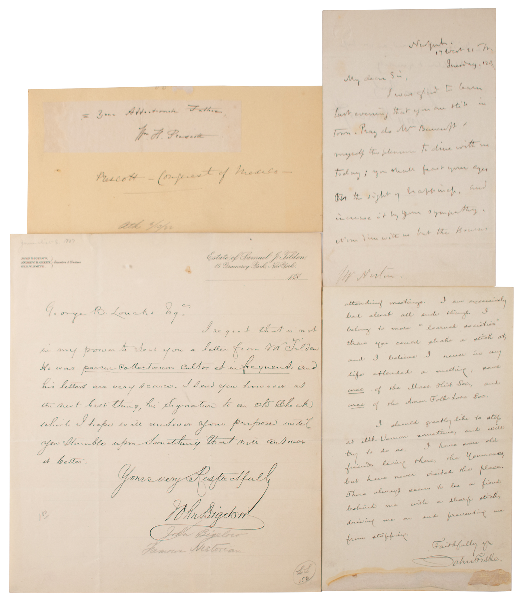 Four items signed by notable 19th century American historians, including: George Bancroft (ALS), John Bigelow (ALS), John Fiske (ALS), and William H. Prescott (signature). In overall very good to fine condition.