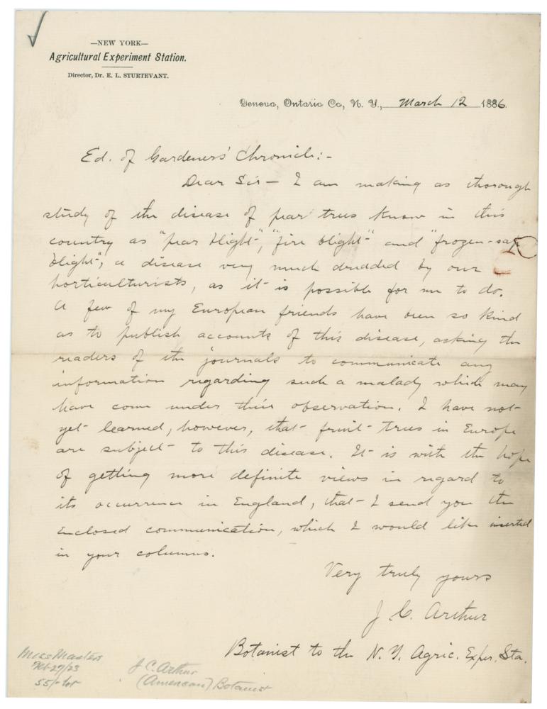 Pioneering American plant pathologist and mycologist (1850-1942) best known for his work with the parasitic rust fungi. ALS signed “J. C. Arthur, Botanist to the N. Y. Agric. Exper. Sta.,” one page, 8.5 x 11, New York Agricultural Experiment Station letterhead, March 12, 1886. Handwritten letter to the editor of Gardener's Chronicle, in part: "I am making as thorough study of diseases of pear trees known in this country as 'pear blight,' 'fire blight' and 'frozen-sap blight,' a disease very much dreaded by our horticulturists, as it is possible for me to do. A few of my European friends have been so kind as to publish accounts of this disease, asking the readers of the journals to communicate any information regarding such a malady which may have come under their observation. I have not yet learned, however, that fruit-trees in Europe are subject to this disease." In fine condition.
