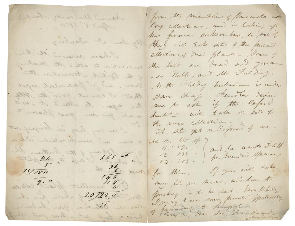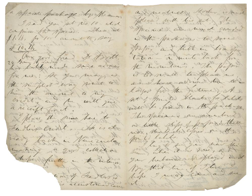 The second, in part: "I have delayed to send a reply to your kind letter?until I should find a good opportunity of sending on to you the sets of Fendler's Venezuela collection of plants, for which you ask. This week's steamer takes the bundle to London?I send you set no. 10—which comprises 665 species?He is already back in Venezuela, making a good collection?Hooker is much pleased with his set. The specimens are much crowded in the packages." In very good condition, with scattered staining and soiling, some show through of arithmetic notations to the first letter, and paper loss to the first page of the second letter (affecting some of the writing).