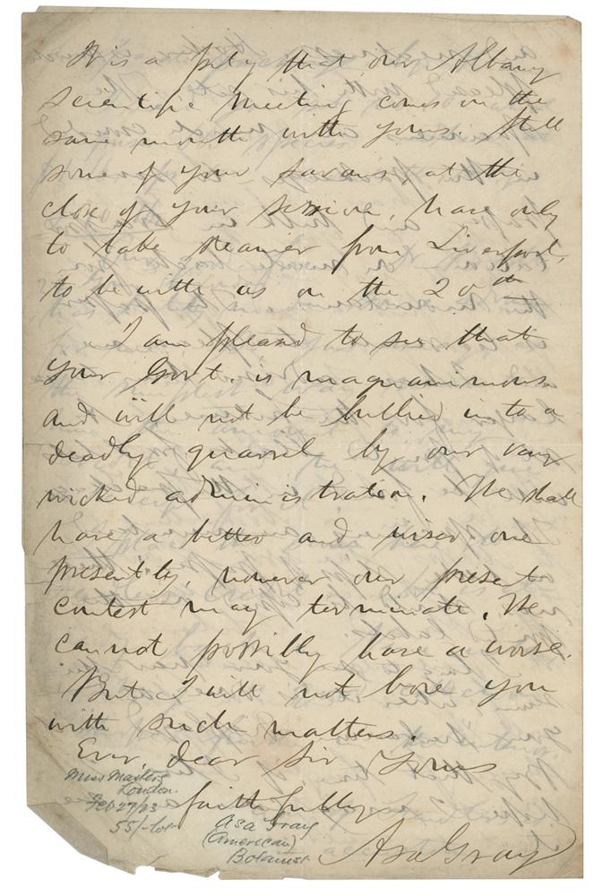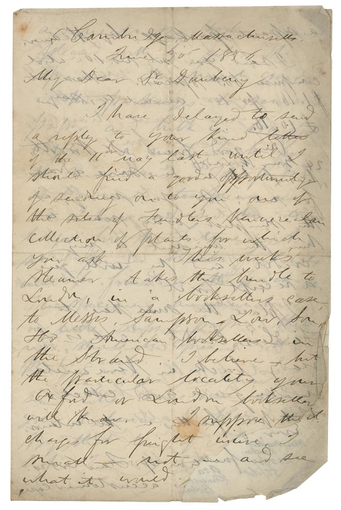 Botanical writer and taxonomist (1810-1888) considered to be the most important American botanist of the 19th century. Darwiniana, a collection of his essays, was considered an important explanation of how religion and science were not necessarily mutually exclusive. Two ALSs by Asa Gray, totaling six pages on two sets of adjoining sheets, 5.25 x 8, April 8 and June 30, 1856. Both to English chemist, botanist and geologist Charles Daubeny. The first, in part: "I have viewed the kind invitation to attend the meeting of the British Association this year, and I particularly regret that I cannot cross the Atlantic again to attend it?I am very busy in bringing out a new and much extended edition of my Botany of the Northern U S. which I hope to complete next month. Our excellent plant collector Mr. Fendler, of whose fine New Mexican collection, your herbarium has a full set—has just returned from the mountains of Venezuela with large collections, and is looking up his former subscribers, to see if they will take sets of the present collections of dried plants—some of the best are dead and gone—as Webb, and Mr. Fielding. As the Fielding herbarium is under your charge, Fendler desires me to ask if the Oxford herb'm will take a set of the new collection."