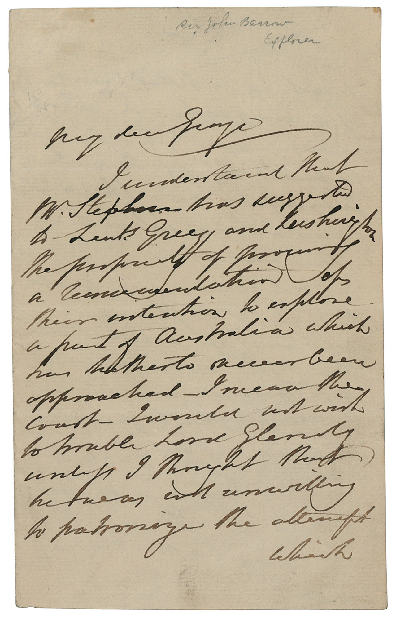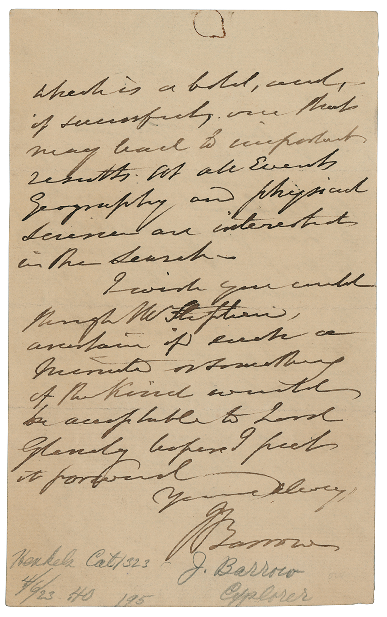 British naval administrator and explorer (1764-1848) who mapped the interior of South Africa and promoted the exploration of the Arctic; the Barrow Strait in northern Canada was named in his honor. ALS signed "J. Barrow," one page, 4.25 x 7, no date. Handwritten letter expressing a fellow explorer's "intention to explore a part of Australia which has hitherto never been approached," and soliciting support "to patronize the attempt which is a bold, and, if successful, one that may lead to important results." He adds: "At all events geography and physical science are interested in the search." In fine condition.