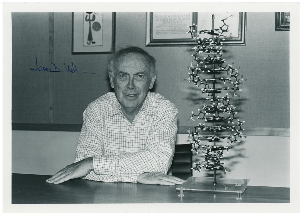 Glossy 7 x 5 photo of Watson posing with a model of the 'double-helix' structure of DNA, signed in blue ballpoint, "James D. Watson." In very fine condition.