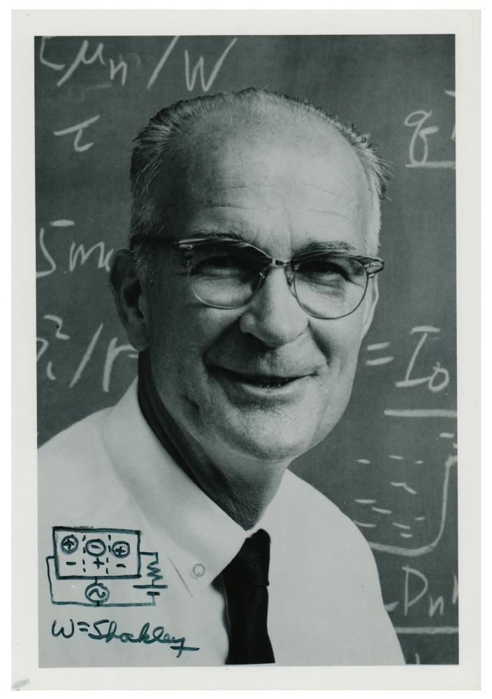 Glossy 5 x 7 head-and-shoulders photo of Shockley in front of a blackboard, signed in black felt tip, "W=Shockley," with a sketch of a transistor above. In fine condition.