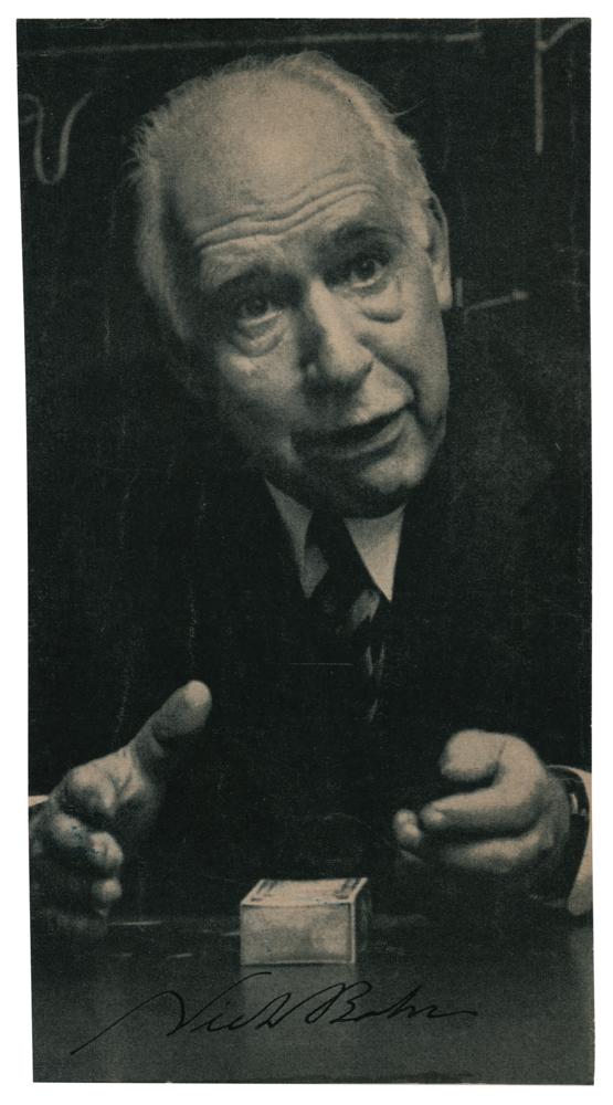 Uncommon 4 x 7.75 magazine photo of the revered physicist speaking, neatly signed at the bottom in fountain pen, "Niels Bohr." Affixed to a same-size card and in very good to fine condition, with overall wrinkling from mounting.
