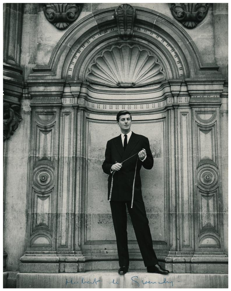 French fashion designer (1927-2018) who founded the House of Givenchy in 1952, famous for designing clothes for the likes of Audrey Hepburn and Jacqueline Kennedy. Handsome glossy 8 x 10 photo of Givenchy holding a measuring tape in a classic architectural alcove, signed at the bottom in blue ballpoint. In fine condition. Accompanied by a transmittal letter from his secretary, dated March 30, 1955. An absolutely impeccable image of the groundbreaking designer.