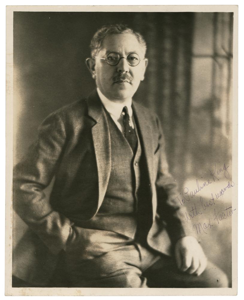 Polish businessman (1872-1938) who largely developed the modern cosmetics industry as founder of Max Factor & Company. Rare pearl-finish 8 x 10 three-quarter-length portrait of Factor, signed and inscribed in fountain pen, "To Pauline King, with best regards, Max Factor." In fine condition. This is the only Max Factor autograph we have ever offered.