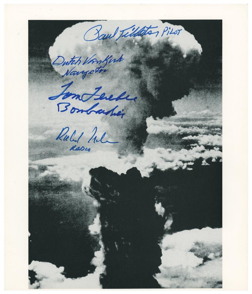 Cardstock 8 x 9.5 photo of the mushroom cloud over Hiroshima, signed in blue felt tip by members of the Enola Gay crew: "Paul Tibbets, Pilot," "Dutch Van Kirk, Navigator," "Tom Ferebee, Bombardier," and "Richard Nelson, Radio." In fine condition, with a trimmed bottom edge.